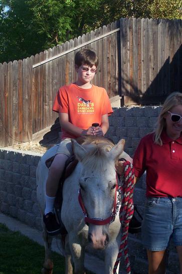 Craig Roest rides the largest of the three ponies at Karen's party. He seemed to sprout inches this past summer, and as of this writing lost three teeth within the last week!