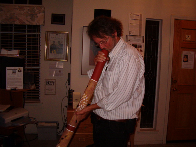 After his concert and a great meal at Infusion Global Cuisine in El Dorado Hills, James Kline demonstrates circular breathing in an Australian didjeridoo. An amazing sight and sound to end the day with!