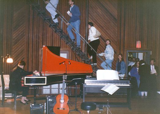 A historical note - before the annual Great Guitars! concerts I started in 1997, an assortment of musicians played in the dome of the observatory. The snapshot below taken by Steve Waldee in 1987, shows harpsichordist Regina Roper at her instrument, mine and amplification in the foreground, and me off to the side. The concert has finished, and the audience is off to hear a lecture on astronomy and queue up to look through the giant telescope. In 1997 the annual concerts were moved from the dome to inside the great hall. Each location has its challenges - the hall was cold - whatever the night air temperature was - the hall is warmer but very long and narrow. But the Lick Observatory experience is unique and magical. World traveler Muriel Anderson calls it her favorite gig.