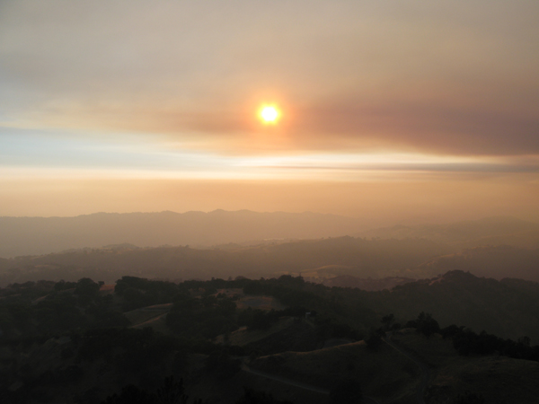 SMOKEY SKIES from the Lick Fire in the mountains west of Lick Observatory during the Great Guitars! concerts, the last in the 2007 Music of the Spheres series. So named for the fire being first spotted from the observatory, it rained ash and affected post-concert viewing. Photo by Valerie Versis.